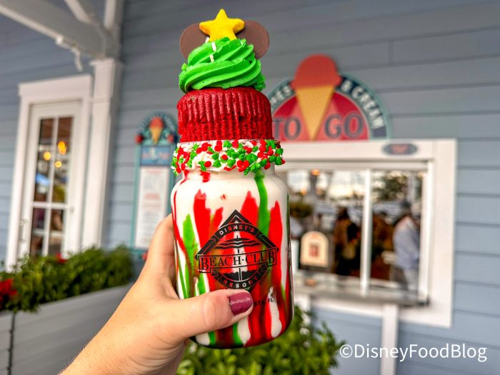 At Beaches and Cream at Disney’s Beach Club, you can always trust you’ll find a decadent specialty shake. Now, you can get the very festive Holiday Shake which is a cookie butter milkshake with caramel drizzle and holiday sprinkles topped with a Christmas tree cupcake. All of it is $15.50.