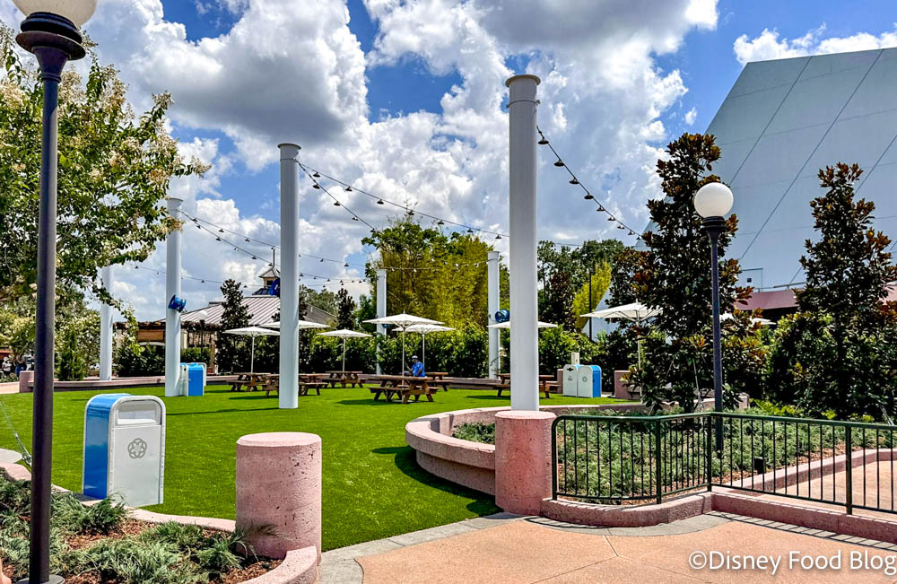 Beyond the statue are gardens spread throughout four quadrants. In the middle, there’s a planter. What’s really cool, though, is that from an aerial view, the ground forms the EPCOT logo. The best part of this area, though, could be all the seating available. There are loads of benches, tables, and chairs, as well as outlets for charging your devices.