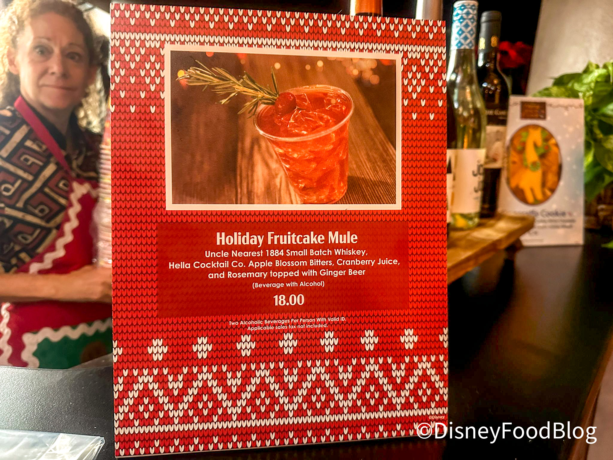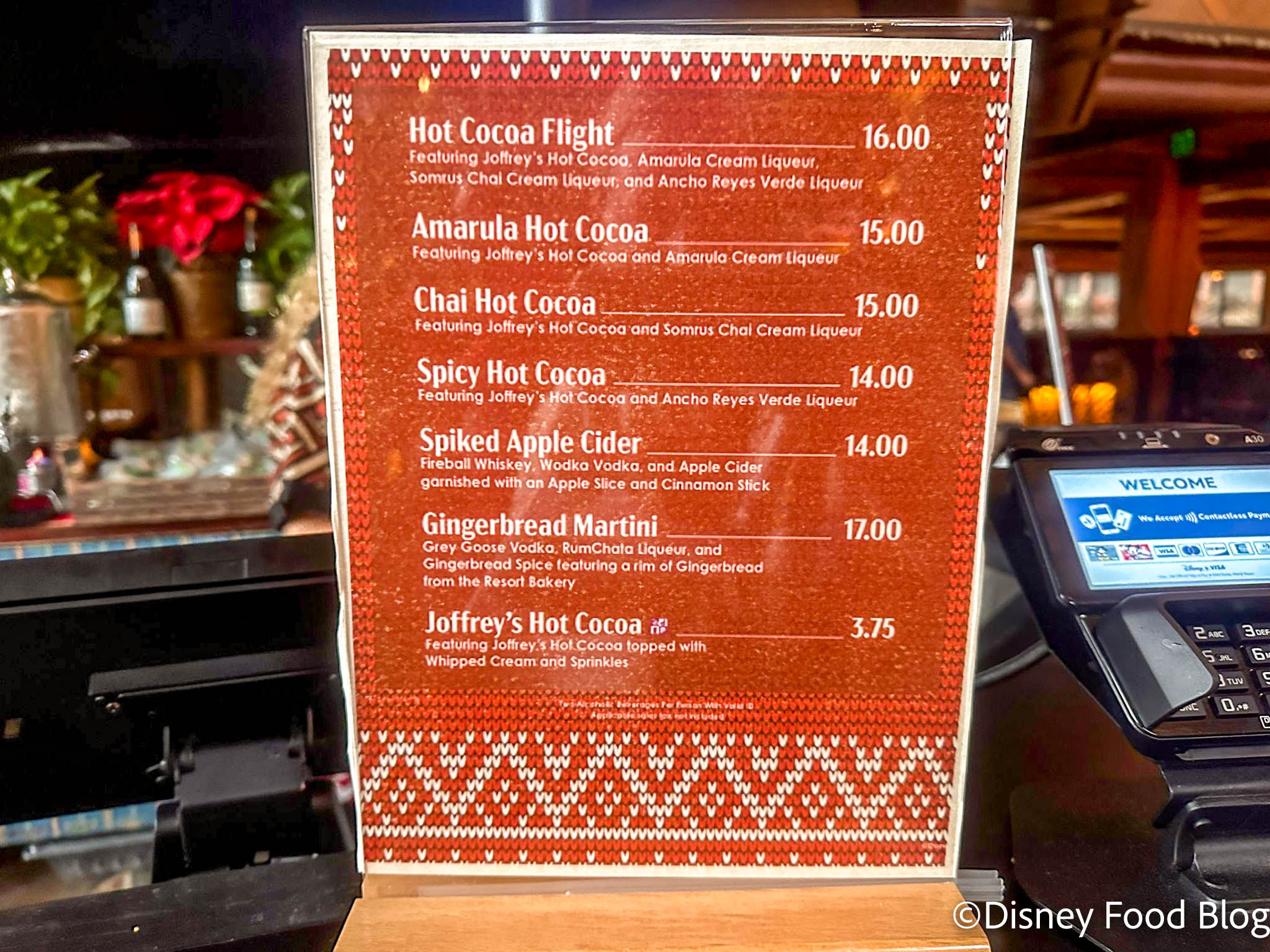 Here, you can snag a variety of festive sips, from hot chocolate to some… stronger beverages. Yep, you can get boozy (holiday-style) in the Animal Kingdom Lodge. Here’s a peek at the menu.