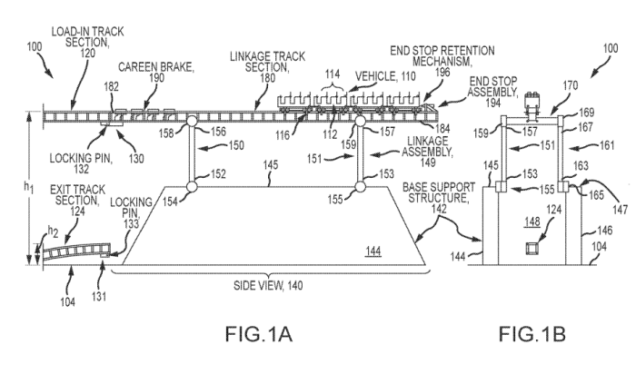 But then it takes a turn (or should we say drop) for something entirely new and never seen before –it “includes a drop swing propulsion system that is adapted to drop a section of track upon which the passenger vehicle is supported from a first elevation to a second elevation that is lower than the first elevation.”