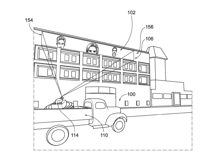 A newer Disney patent, dated March 14th, 2023, is for a piece of technology called “Relative Surface Traveling Map Projection Process.” As in, projecting onto surfaces near the traveling projector using projection mapping. This projector patent is looking to seamlessly project scenes onto buildings, screens, statues, rocks, or other things while MOVING.