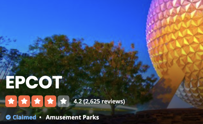 EPCOT won the best-rated Disney World park according to Yelp reviews! It had 4.2 stars with over 2,600 reviews.