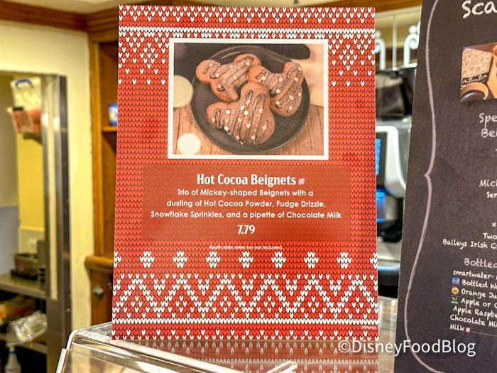 This dish comes with THREE Mickey-shaped Beignets with a dusting of hot cocoa powder, fudge drizzle, snowflake sprinkles, and a pipette of chocolate milk.