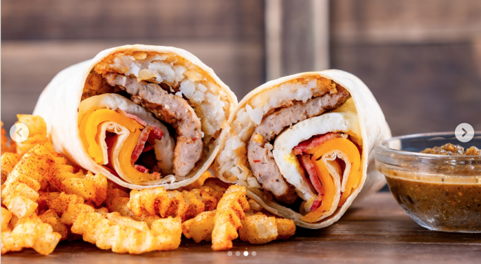 …a Classic Breakfast Burrito made with sausage, bacon, egg, cheddar, and hash browns with Molcajete salsa…