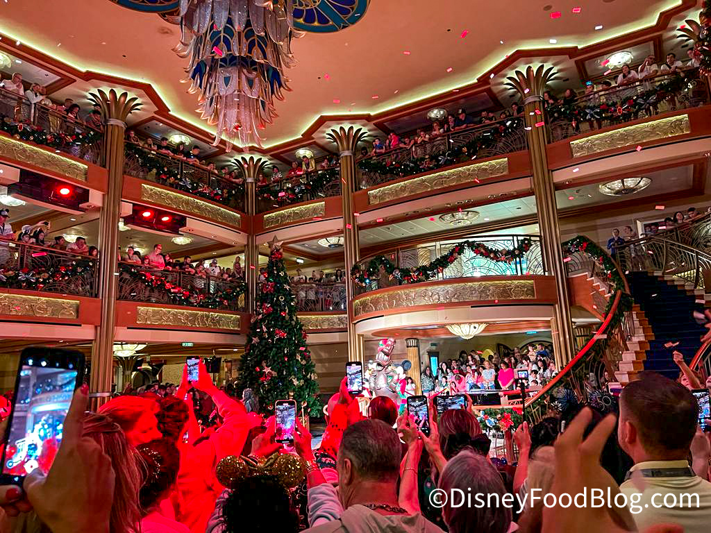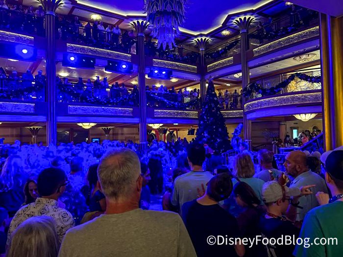 During this special holiday cruise, there’s a Christmas Tree Lighting that takes place on your first night on board. You can find information about it in your Disney Cruise Line Navigator app. We headed down to the atrium to get a good spot…along with…everybody else, apparently.