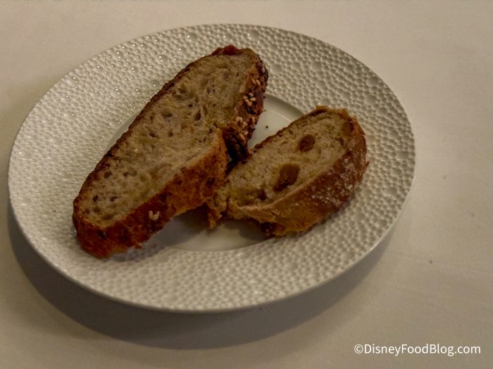To begin, we were given four bread options to choose from. We started with the sourdough topped with poppy and sesame seeds and a fig & rye piece of bread. These were coarse but moist. However, the next two were our favorite.