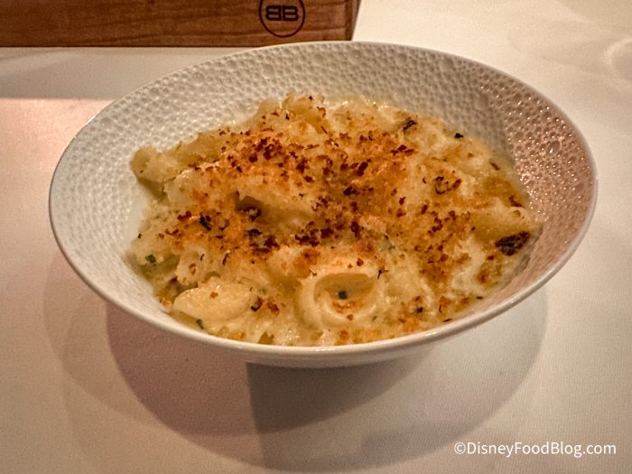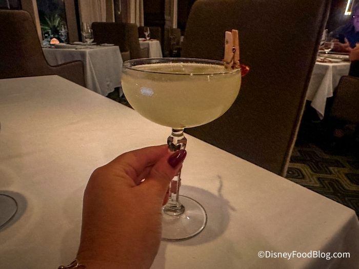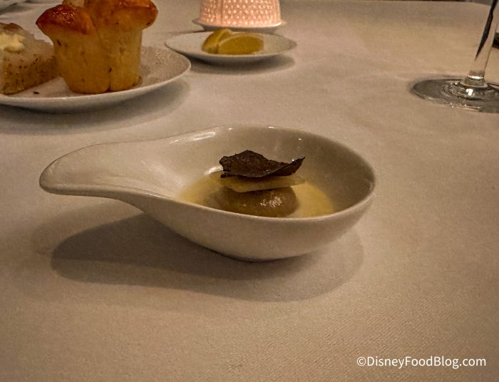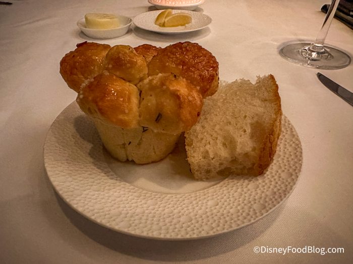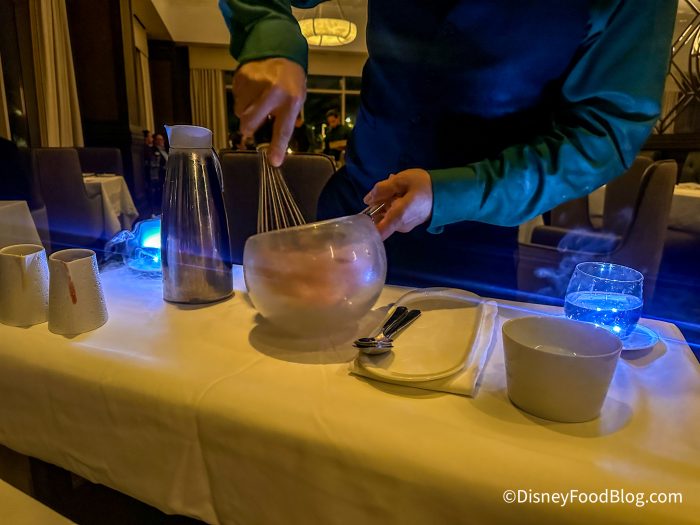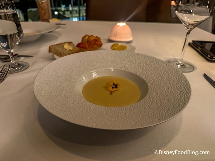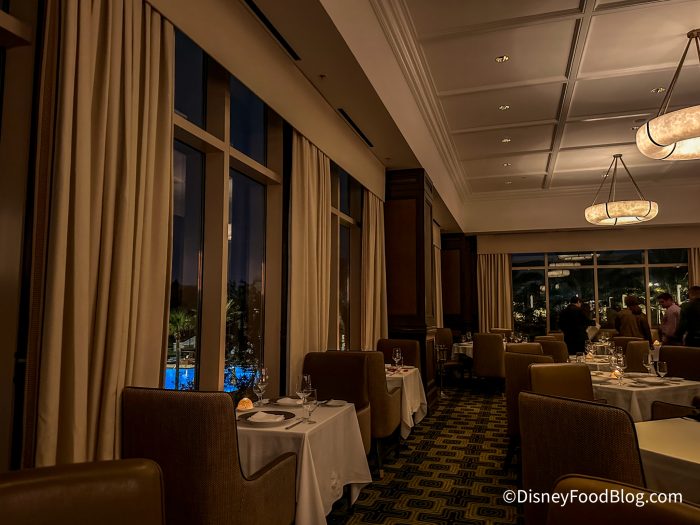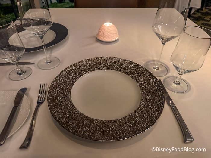 The restaurant is surrounded by large windows, giving you a gorgeous view of the pool and night sky. Depending on your reservation time and view, you might be able to catch a glimpse of fireworks from EPCOT. The place setting was beautiful, and our server let us know that the dishes were from France.