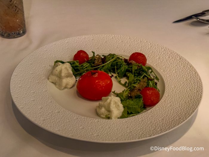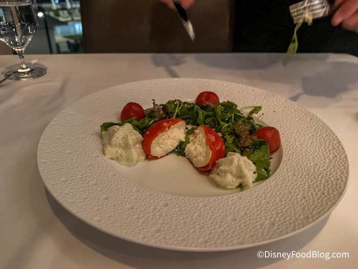 Next, we ordered The Tomato for $24. This consisted of Confit Heirloom Cherry Tomato, Burrata Mozzarella, Pumpernickel, Arugula, White Balsamic Caviar, and Basil Foam.
