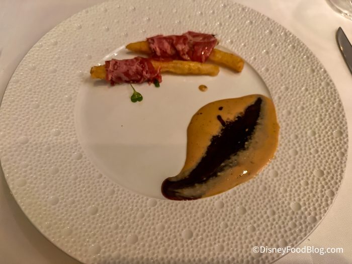 The chef then sent out an amuse-bouche, which was the Pasta Explosion. This light bit is Pata Negra de Bellota with Parmigiano Reggiano for $23. Our server told us that the pasta explosion was meant to be consumed in one bite. They suggested it sit on the roof of our mouth to dissolve. It was creamy and cheesy.
