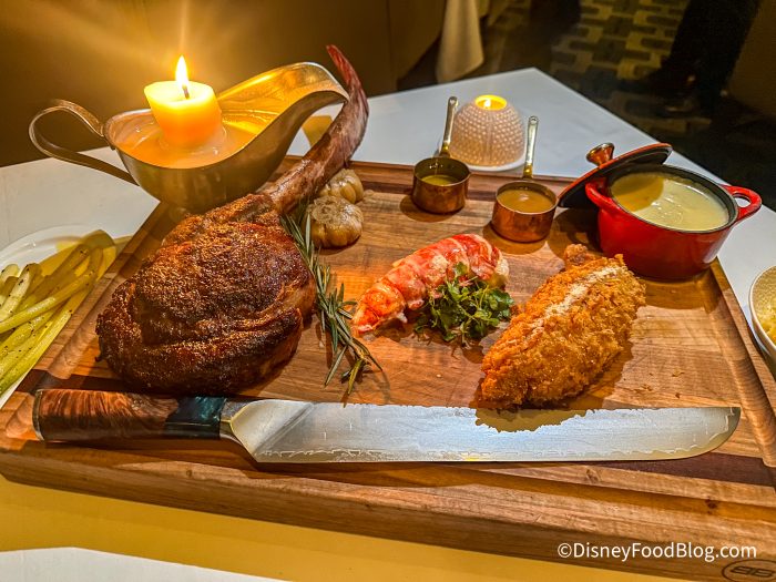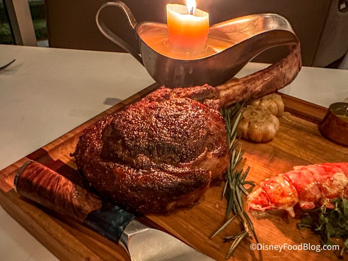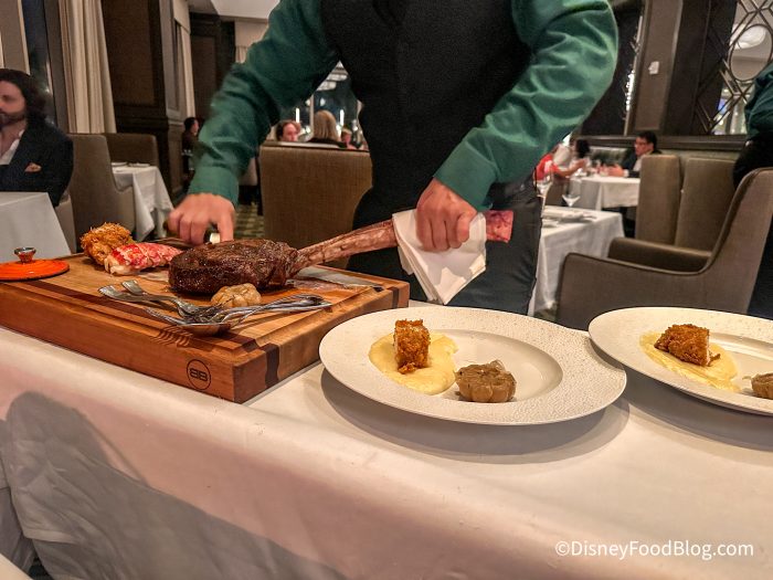 First, the presentation is phenomenal. The board comes with a beef fat candle that they use to pour over your steak. The server will cut the steak off the bone and plate it table side for you.
