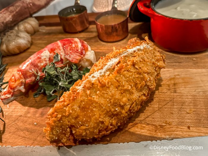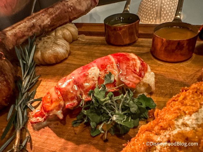 It was time for entrees, and there were so many on the menu to choose from. However, we decided on the Bull and Bear Carving Board. While this comes with a $300 price, you get a LOT of food for it. It comes with Tomahawk Steak, Fried Chicken, Maine Lobster Tail, and a Choice of Two Sides. We know, $3oo is a lot, but look at this board!