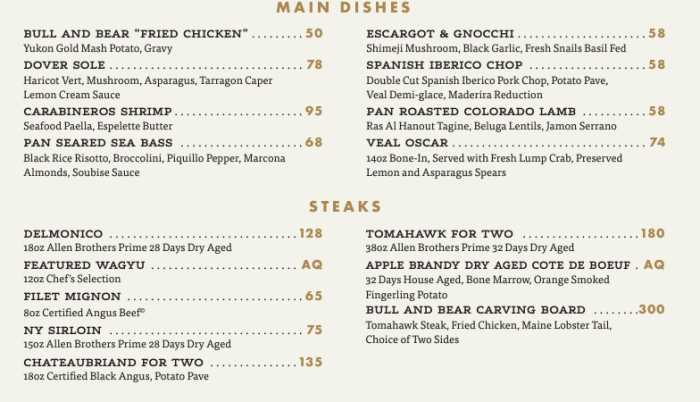 This restaurant is modeled after the original Bull & Bear Restaurant in New York City. The restaurant recently underwent some renovations and now has an updated interior, as well as some new menu items.