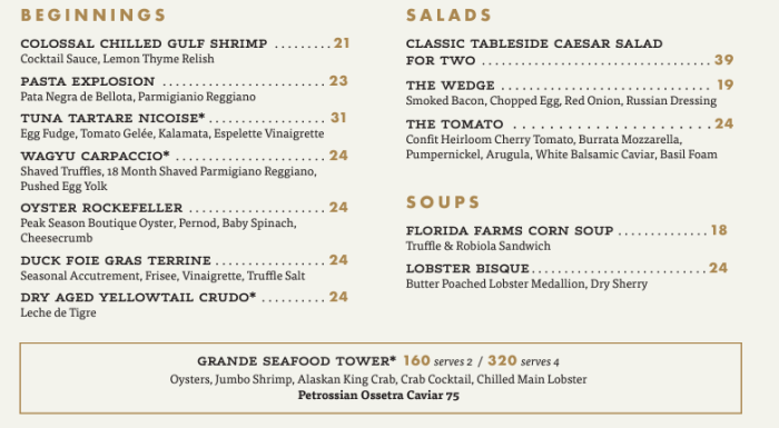 Here’s a look at the menu. For starters, you can choose from Oyster Rockefeller, Tuna Tartare, or Dry Aged Yellowtail Crudo. There is also a seafood tower that serves either 2 or 4 people.