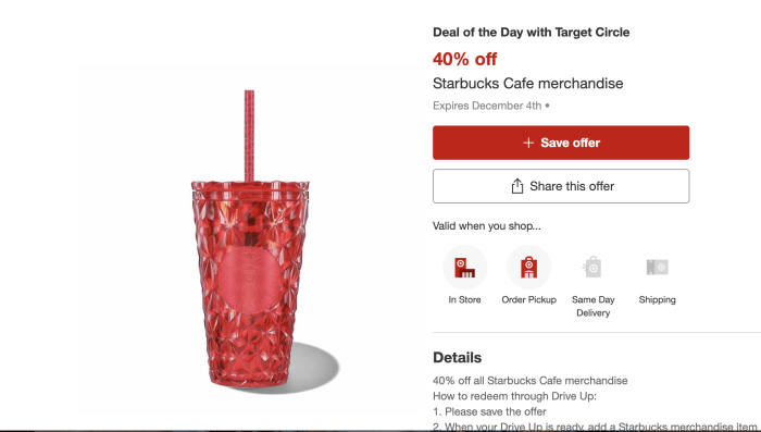 Today, December 4th, Target is offering 40% off Starbucks merchandise! That’s right when you purchase in-store or online for drive up, you can receive 40% off your that new Starbucks tumbler you’ve been eyeing up.