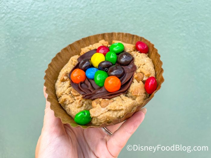 This is a peanut butter cookie, chocolate frosting, and peanut butter M&Ms.