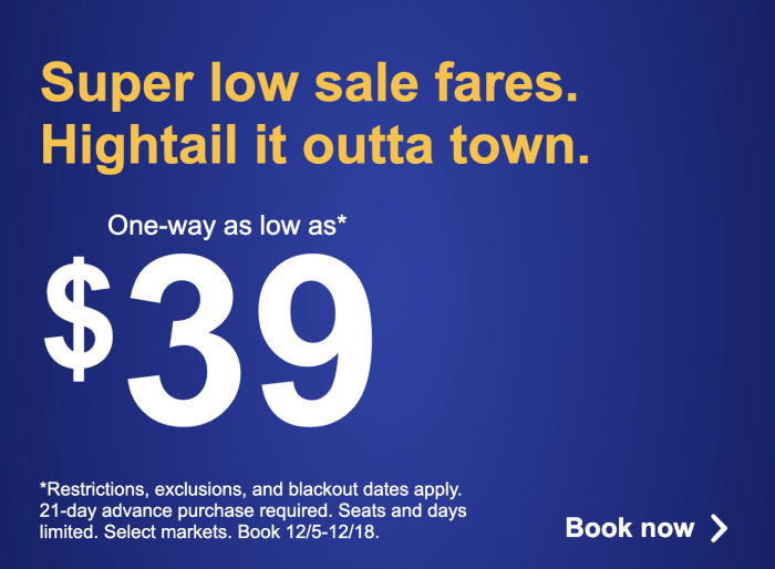 To take advantage of the sale, you need to book your flights on Southwest.com before 11:59PM on December 18th, 2023. The sale is for flights that take place between January 3rd, 2024, and May 22nd, 2024. If you’re flying to Hawaii, San Juan, Puerto Rico, or an international destination, you must travel between January 9th and May 22nd, 2024.