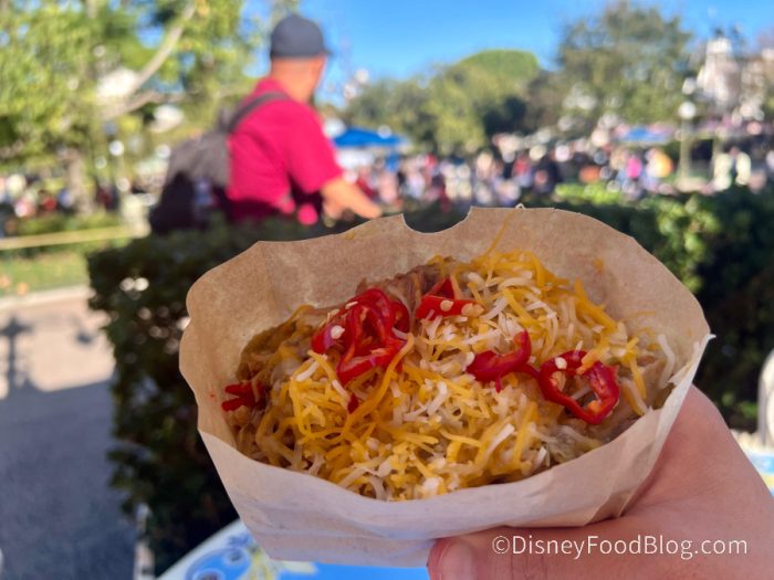 Over at Refreshment Corner on Main Street, U.S.A., you can usually find quick-service American cuisine like hot dogs and mac & cheese. However, right now, Refreshment Corner is offering TWO limited-time seasonal items — the Cinnamon Roll Pretzel and the Chile Verde Firefly Chips. But were they any good? Read ahead to find out!