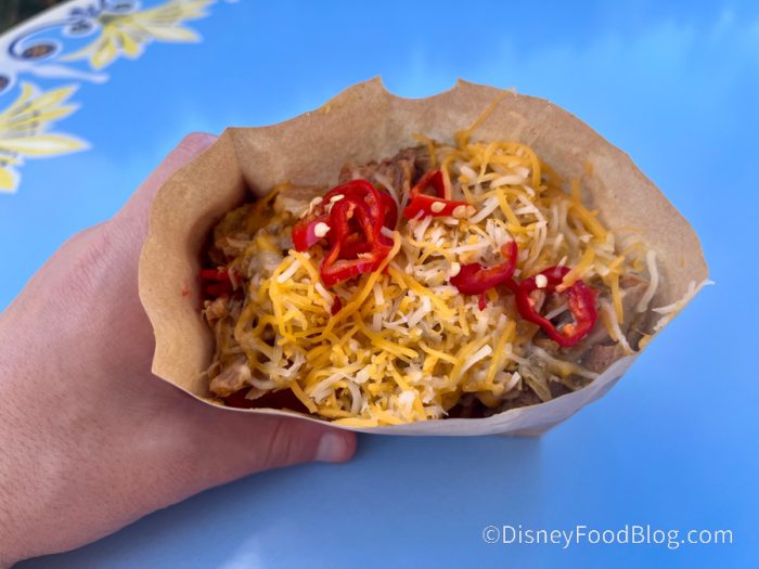 The pork is the real standout of this snack. The chile verde seasoning is very tasty and lingers after each bite, prompting you to take another. The cheese blend also adds a welcomed layer that not only adds good flavor but also helps to curb the heat. We do recommend you eat this fast, though, as all the components make for a soggy snack.