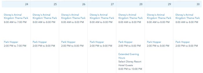 Hours for Disney’s Animal Kingdom have also changed. Animal Kingdom is open from 8AM to 7PM on December 24th (previously 9AM-7PM) and from 8AM-8PM (previously 9AM-7PM) on December 25th through 30th. Extended Evening Hours are on December 28th from 8PM-10PM.