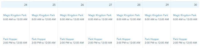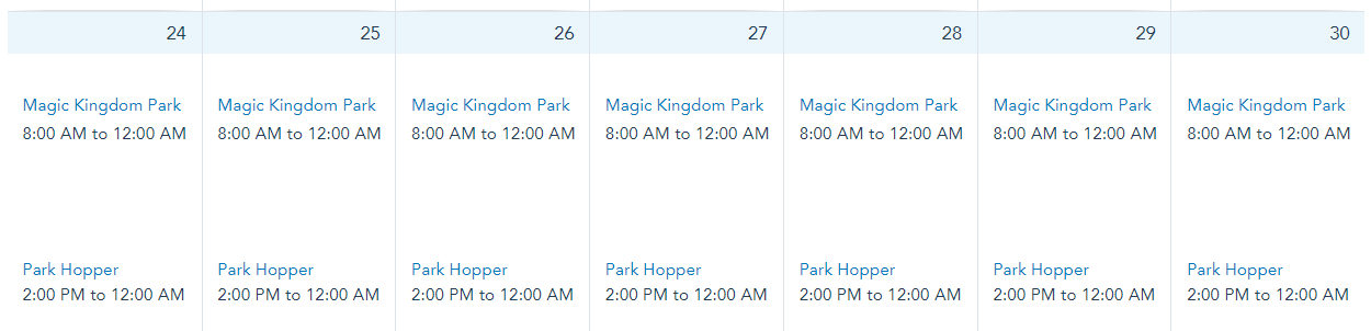 Okay, let’s talk about some other changes to park hours. We noticed that the hours for Christmas week have been extended. Magic Kingdom hours have changed to 8AM-midnight (previously 9AM-9PM) for December 24th through 30th.