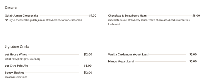 For beverages, choose from a few different alcoholic options, as well as a selection of yogurt lassis.