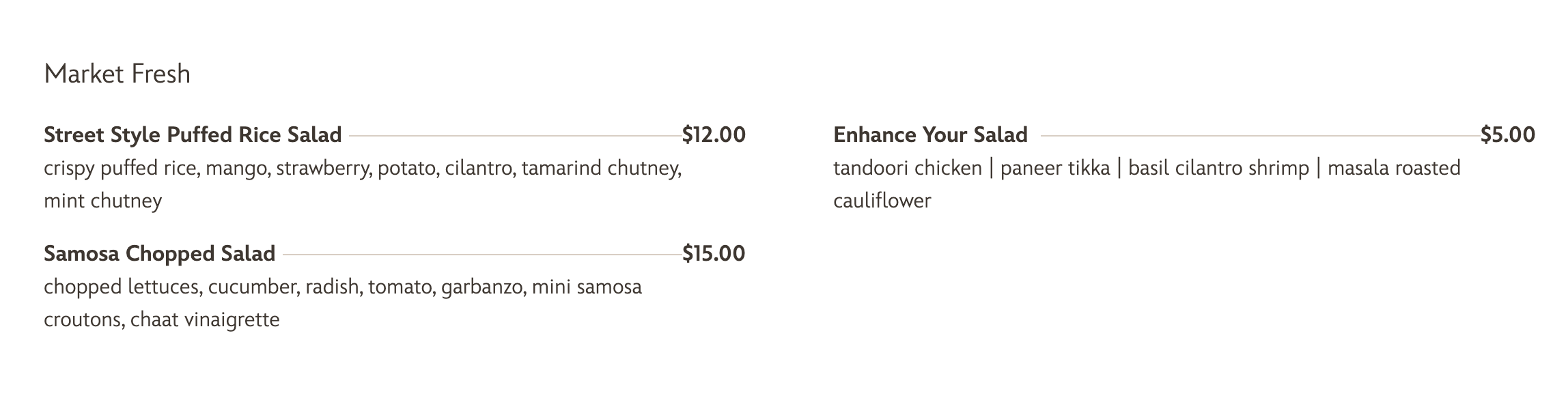 Another item you’ll find on the sharables menu is the D.I.Y. Pani Puri. It’s $12 and comes with crispy semolina puffs, black garbanzo beans, potatoes, tamarind, date chutney, and mint cilantro water.