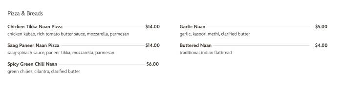 If you love naan, then you need to check out their pizzas and breads section! You can choose from two pizzas or three types of naan.