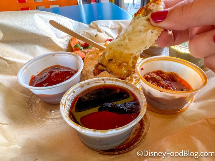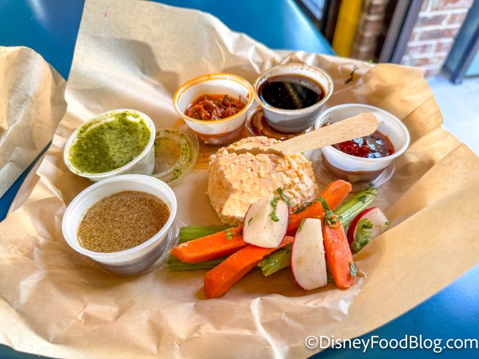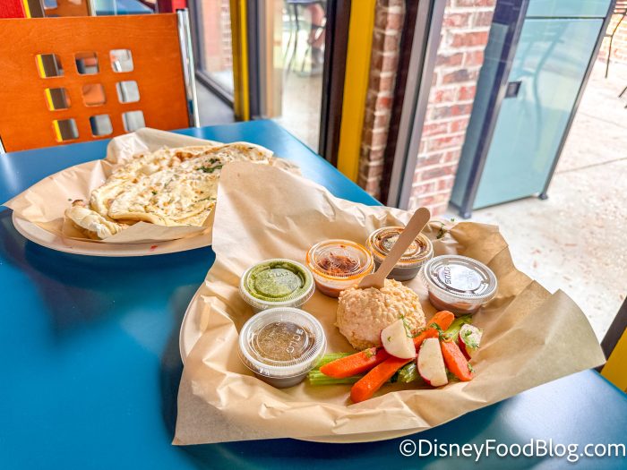 Let’s start out with the sharables. You know that we love a good bread service here at DFB, so when I saw the EET Bread Service with Pimento Whipped Paneer on the menu, I knew I’d have to try it! It comes with buttered naan, garlic naan, pimento whipped paneer cheese, masala vegetable sticks, Indian pickle, coriander honey, and various chutneys.