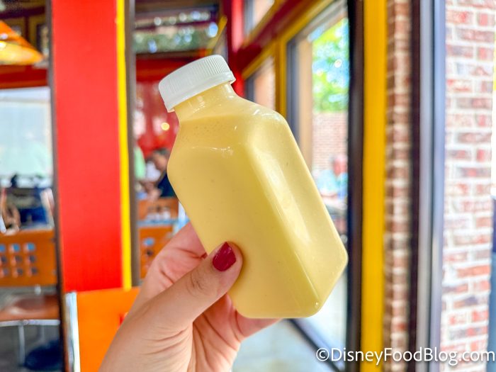 But I didn’t go through the whole meal without beverages! I also picked up two drinks. First, let’s talk about the Mango Yogurt Lassi. It’s $5 and comes served in a little bottle.