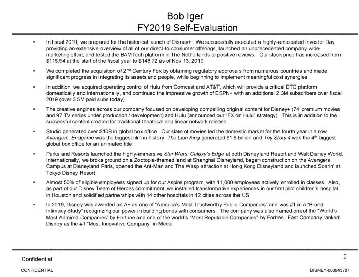 Iger told the board that he “executed a highly-anticipated Investor Day providing an extensive overview of all of our direct-to-consumer offerings” and “launched an unprecedented company-wide marketing effort.” He also mentions the acquisition of 21st Century Fox into Disney’s portfolio, along with gaining operating control of Hulu from Comcast — which Disney now fully owns.