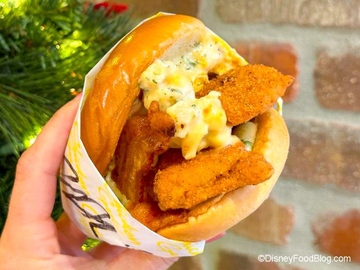 Okay, hold up because we’re STILL not done. We HAD to get the Buffalo Mac ‘n’ Cheese Big Bite Sandwich for $9.99. This one has two Chicken Tenders, Mac ‘n’ Cheese, Smoked Bacon, Buffalo, SMC, and Garlic Parmesan. We prefer this over the regular Buffalo Ranch — the Mac ‘n’ Cheese is creamy and herby but wasn’t so mushy that it fell out of the sandwich. The bacon — well, bacon is always a nice salty addition to mac ‘n’ cheese, in our opinion.