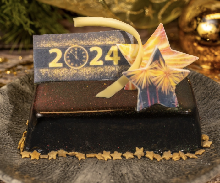 Up next, you can grab the New Year’s Cake Bar from Roaring Fork at Disney’s Wilderness Lodge. This is made with strawberry mousse, champagne gel, vanilla cake, mirror glaze, and chocolate décor and will be around for two days only: December 31st and January 1st.
