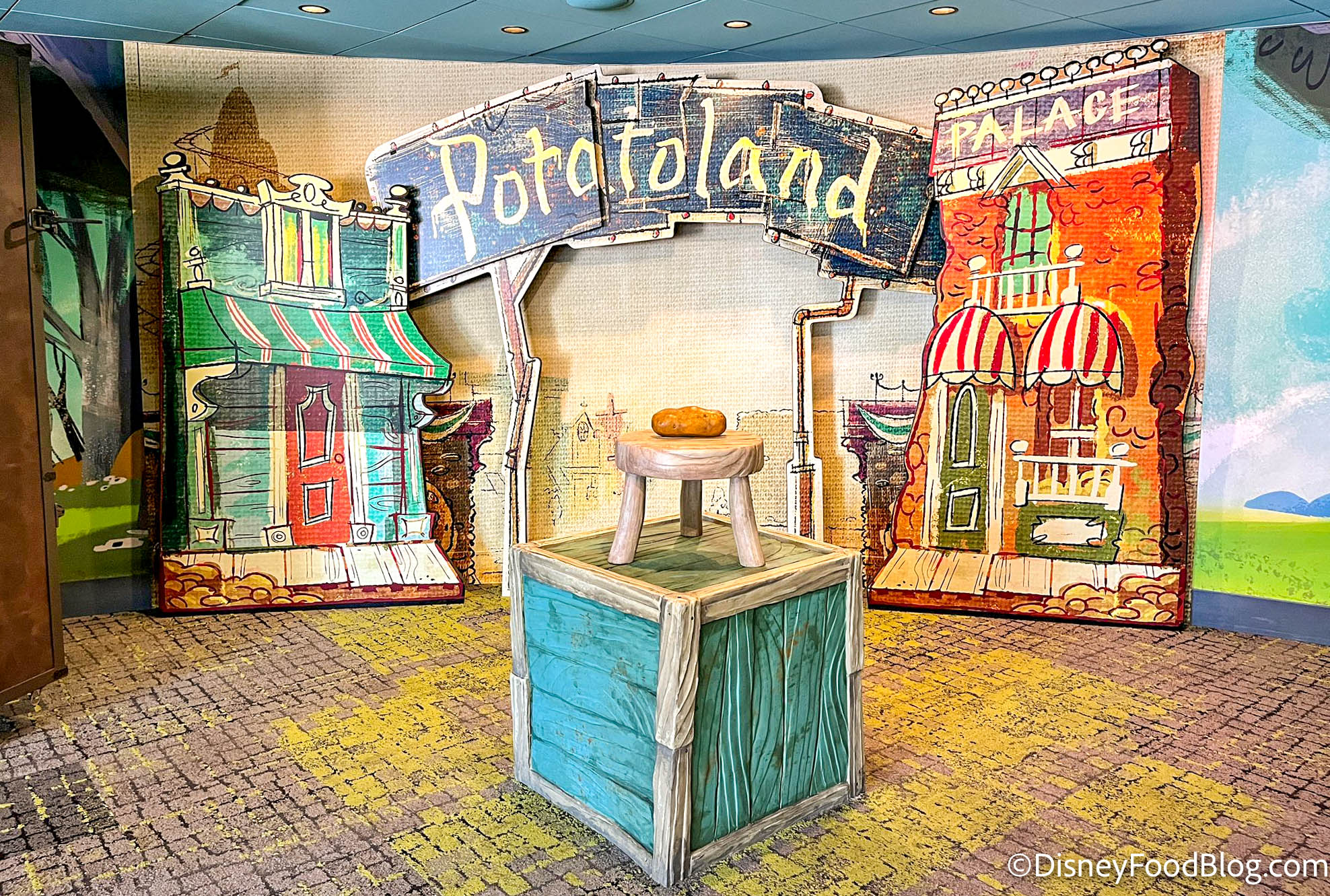 It’s the place you’ll see EVERY night. (Every night in your dreams.) (You probably only understood that reference if you’ve seen the newly-animated Mickey Mouse shorts before — specifically, the one where Mickey, Donald, and Goofy visit “Potatoland.”) And now you can visit Potatoland TOO! At the exit of the Mickey Shorts Theater in Hollywood Studios, you’ll walk through a room with a few different photo ops stations. And one of the photo setups happens to be the one, the only, POTATOLAND (with a prop potato on a stool, and all). Dreams really DO come true.