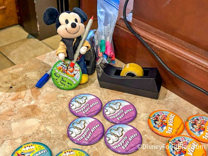 Birthdays. Anniversaries. Honeymoons. Graduations. ANY special event that you might be traveling for can be emphasized with a good ol’ Disney celebration button for you to display proudly on your clothes all day long. Buttons can be picked up from the front lobby of your resort, or at various Disney theme park locations (like guest relations OR select merchandise shops). Now make sure to keep that button fastened to ya ALL DAY LONG. Because you NEVER know when a little extra “pixie dust” will be thrown your way. (And by “pixie dust” we mean “potentially free desserts at table service restaurants.”)