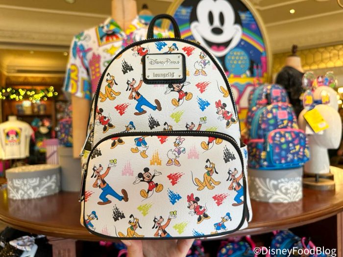 You’ll spot Mickey, Minnie, Goofy, Donald, Pluto, and Daisy, all placed against a white background and a few colorful styles of Cinderella Castle. The side pockets and zippers are outlined in black…