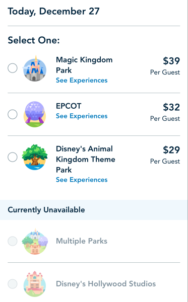 When Genie+ sells out at any of the four parks, the multiple parks option is also marked unavailable. So, if you were planning to park hop on December 27th and didn’t buy the multiple parks option first thing in the morning, you may have been stuck purchasing Genie+ separately for multiple parks.