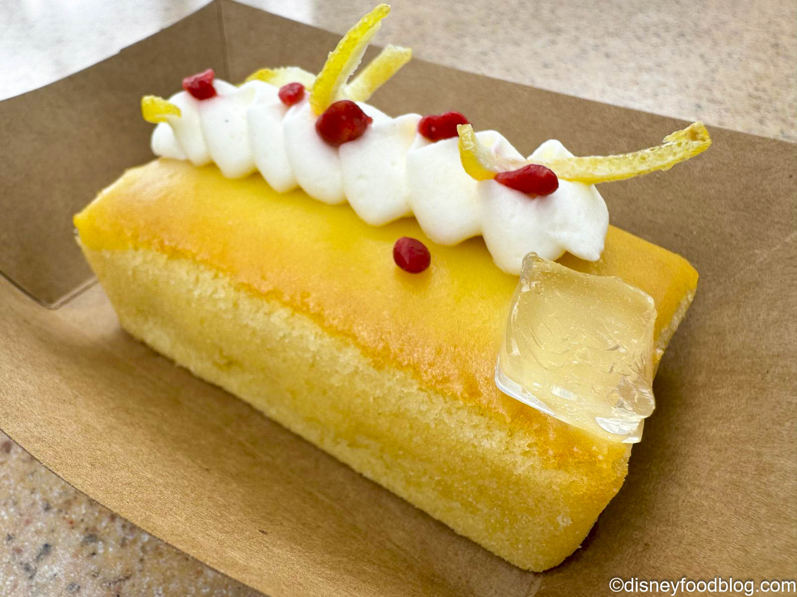 - Olive Oil Cake glazed with lemon curd, topped with vanilla bean Chantilly, and finished with fresh candied lemons, strawberry crunch, and lemon-lime gelée (New) – $7.00