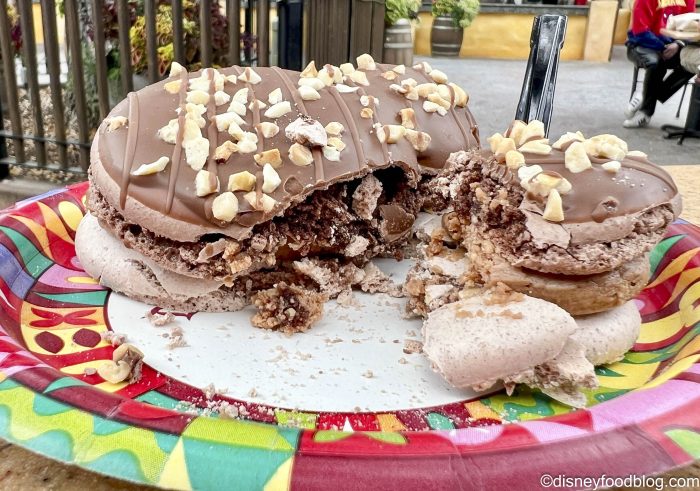 - Mickey-shaped Macaron made with SNICKERS bar pieces: Chocolate Mickey-shaped macaron filled with caramel ganache and made with SNICKERS bar pieces – $7.75