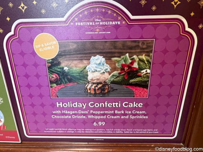 - Holiday Confetti Cake with Häagen-Dazs Peppermint Bark Ice Cream, chocolate drizzle, whipped cream, and sprinkles (New) — $6.99