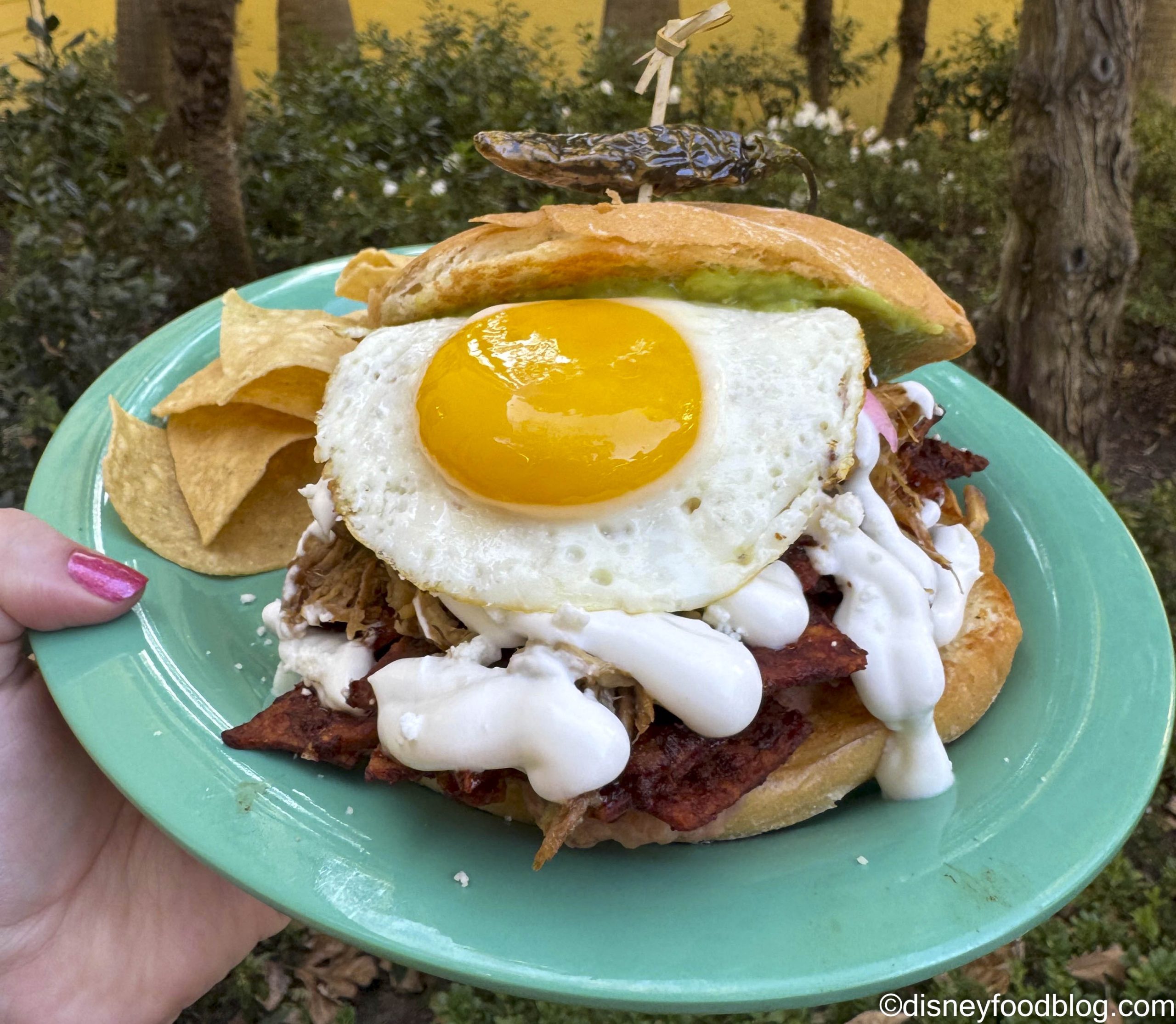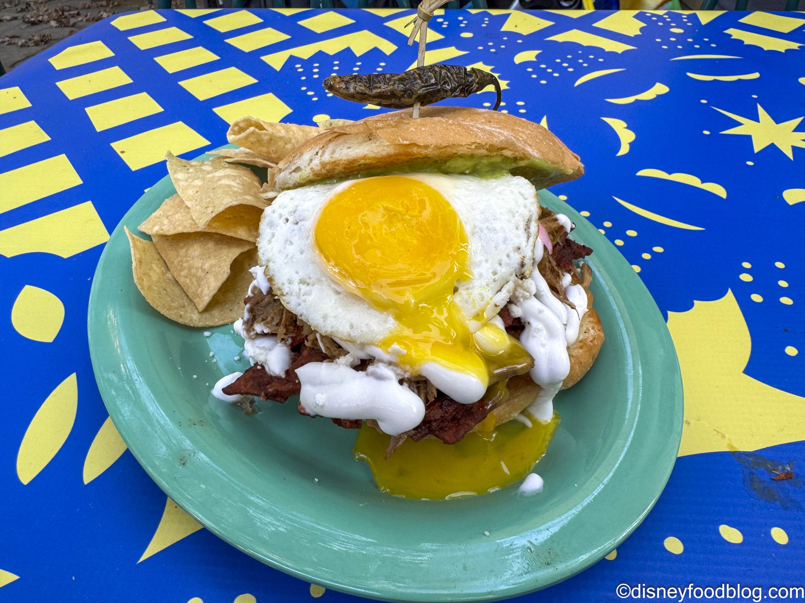 - Chilaquiles Carnitas Torta: Red chilaquiles, refried beans, avocado spread, queso fresco, pickled onions, and a fried egg served with chips (New) – $13.99