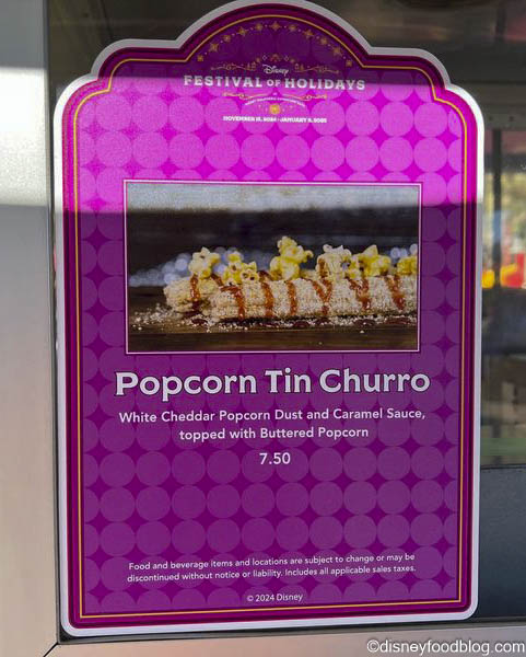 - Popcorn Tin Churro: White cheddar popcorn dust and caramel sauce topped with buttered popcorn (New) — $7.50