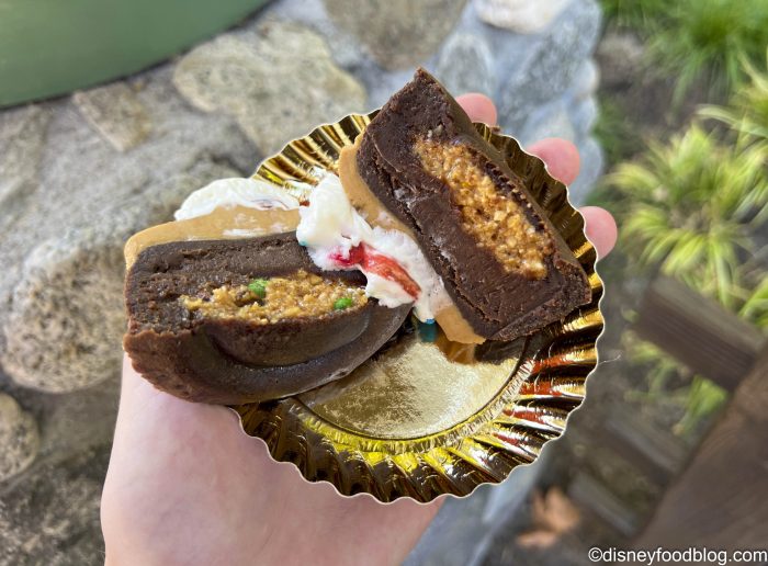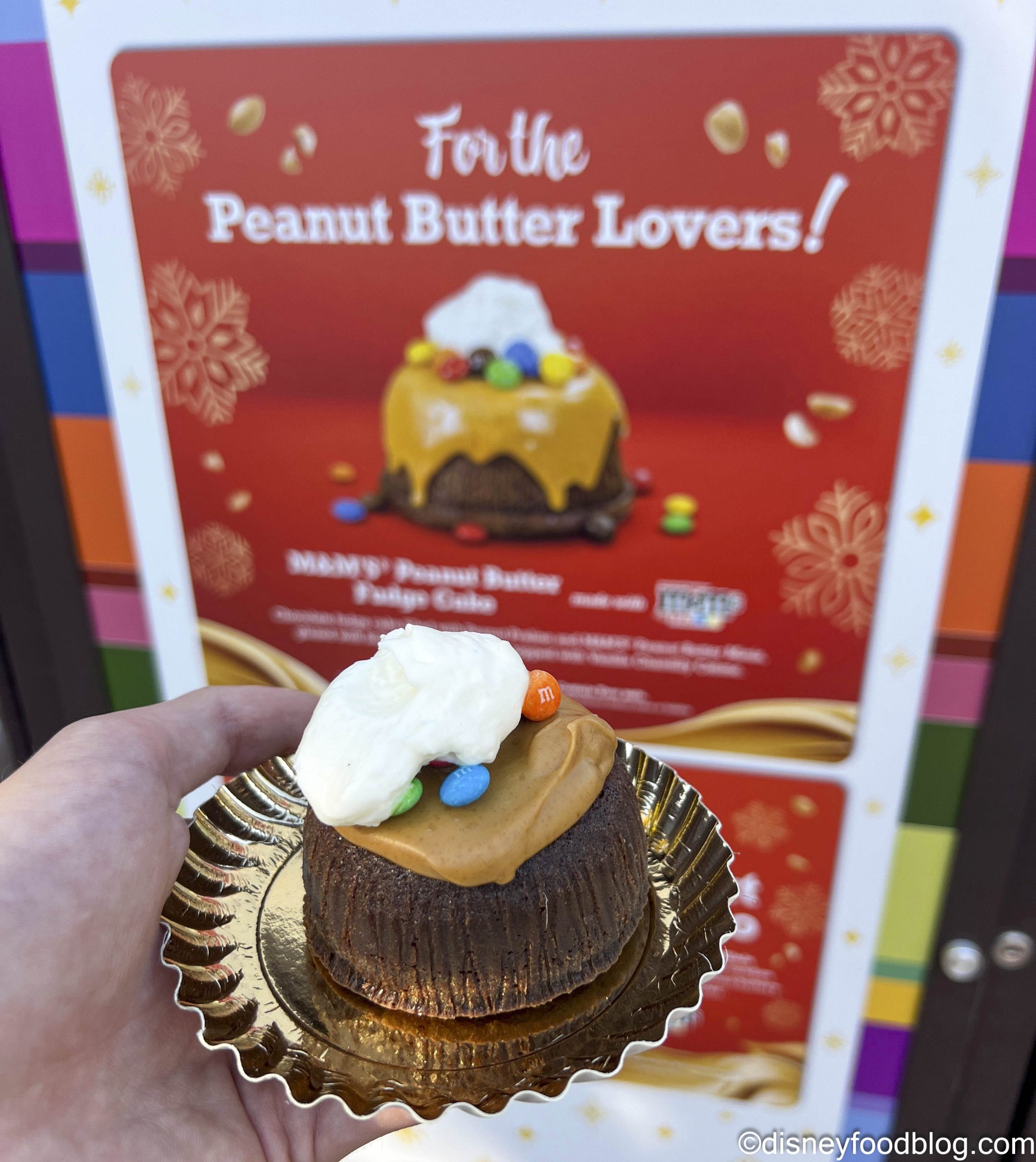 - M&M’S Peanut Butter Fudge Cake: Chocolate fudge cake filled with peanut praline and M&M’S Peanut Butter Minis, glazed with salted peanut butter, and topped with vanilla Chantilly crème (New) – $7.50