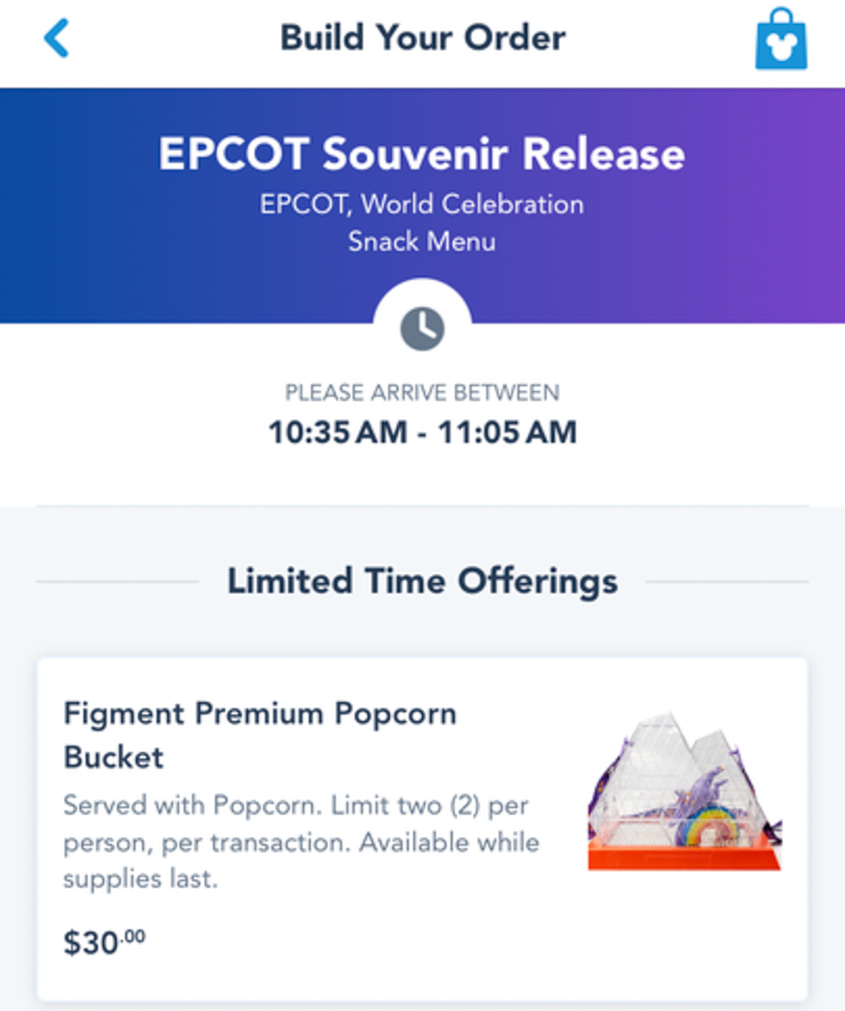 PLEASE NOTE: You cannot purchase the Figment Popcorn Bucket by lining up at the Food Studio — it is ONLY available via Mobile Order for those who wish to purchase the bucket.