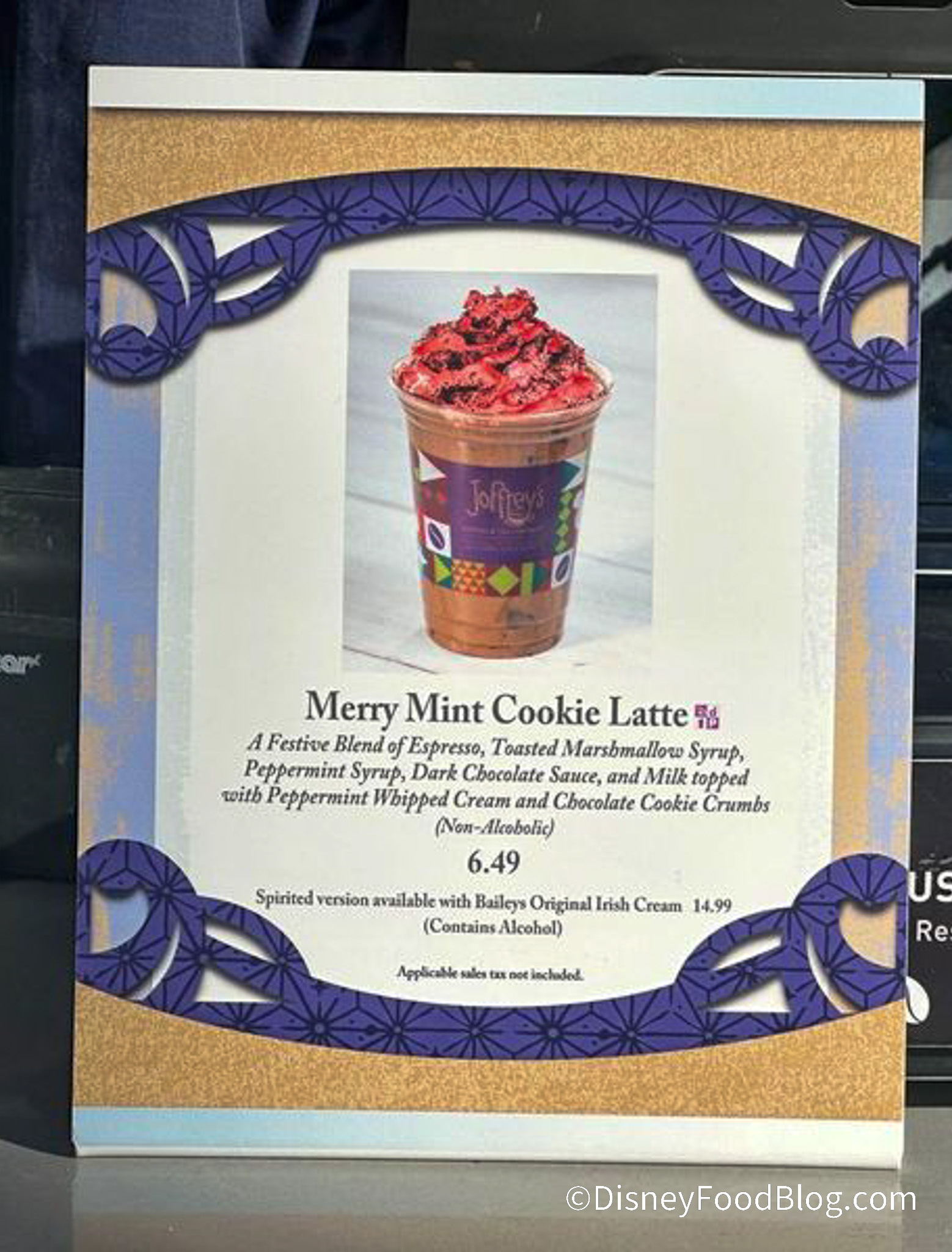 - Merry Mint Cookie Latte: A festive blend of espresso, toasted marshmallow syrup, peppermint syrup, dark chocolate sauce, and milk topped with peppermint whipped cream and chocolate cookie crumbs (Non-alcoholic beverage) (New) – $6.49, DDP Snack Eligible