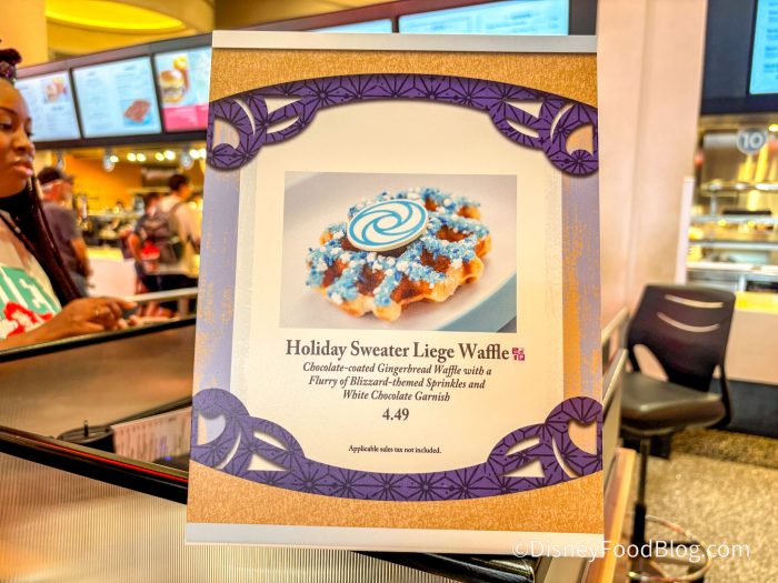 - Holiday Sweater Liege Waffle: Chocolate-coated brioche waffle with a flurry of blizzard themed sprinkles and white chocolate garnish — $4.49, Disney Dining Plan snack credit eligible
