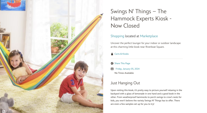Heads up if you were looking to purchase a hammock on your Disney World trip… Swings N’ Things — The Hammock Experts Kiosk — is officially closed!