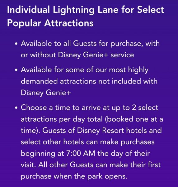 Are you confused yet? Individual Lightning Lane rides are not included in Genie+, but have their own separate thing, so to speak. You do NOT need to purchase Genie+ to purchase an Individual Lightning Lane because the Individual Lightning Lane is its own thing. Whew…that’s so hard to explain, but we hope you get the gist of it.