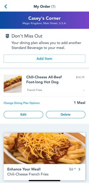 Once you’ve made your order, you can begin to check out. We discovered a cool new feature — the app will let you know if your plan includes something that you didn’t already have in your order! When we went to order a Hot Dog, the app had a notification at the top of the screen that said, “Don’t Miss Out: Your dining plan allows you to add another Standard Beverage to your meal.”