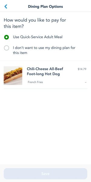 You will need to update that payment selection for every item in your order. The Disney World app automatically applies your Dining Plan credits to all the items, so you’ll have to go through each item individually and choose “I don’t want to use my dining plan for this item” for each one.