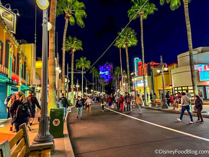 There are shows at the Chinese Theatre, so many people are waiting in this area of the park for those if you enter at 7PM. Be ready for that or arrive a little later if you don’t want to deal with those crowds. We still recommend going inside the park at 7PM so you can maximize your ticket — especially since some of the wait times were already decreasing at this point!
